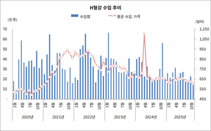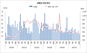 H형강 수입시장에서 일본산 의존도가 여전히 높은 가운데, 베트남이 확고한 공급기반을 구축하며 양강 구도를 형성하고 있다.최근 잠정 수입통관 자료에 따르면 11월 16일 기준 H형강 수입량이 1만 4,415톤을 기록하며 전월 동기(1만 4,527톤) 대비 0.8% 감소한 것으로 나타났다. 톤당 평균 수입단가는 607달러로 전월(621달러) 대비 14달러 하락했다.국가별로 살펴보면 일본이 9,749톤(565만 8,171달러)으로 전체 수입량의 67.6%를 차지하며 최대 공급국 지위를 유지했다. 톤당 평균 수입단가는 580달러를 기록했다
