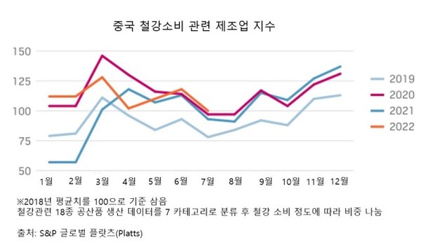 해당 생산지수는 18개 철강 관련 공산품에 대한 중국 국가통계국의 데이터를 7개 카테고리로 분류해 철강 소비 비중에 따라 가중치를 부여하는 기법이 사용됐다. 2018년 월별 생산 평균이 100의 기준선이다. .