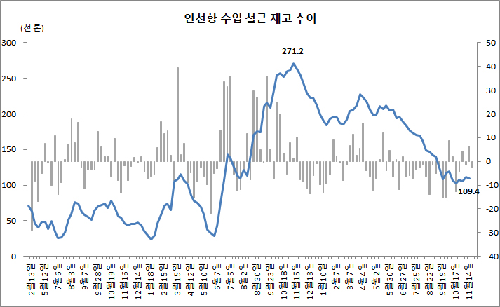 수입 업계에 따르면 28일 기준 인천항 수입 철근 재고는 10만 9,4000톤으로 집계됐다. 지난주 대비 2,400톤가량 줄어든 양이다. 10월 말 이후 매주 증감을 반복하고 있는 모습이다.