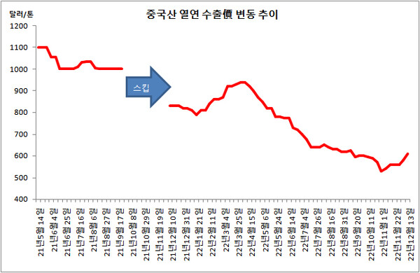 중국산 열연코일 수출 오퍼 가격은 올해 4월 톤당 900달러대 초중반 수준까지 상승했다 이후 수요 감소와 중국 현지 가격 하락 등의 영향으로 약세가 이어지면서 지난 11월 첫주에는 톤당 500달러 초반 수준까지 낮아졌다가 이후 다시 반등하면서 12월 들어 600달러대를 회복한 것으로 나타났다.