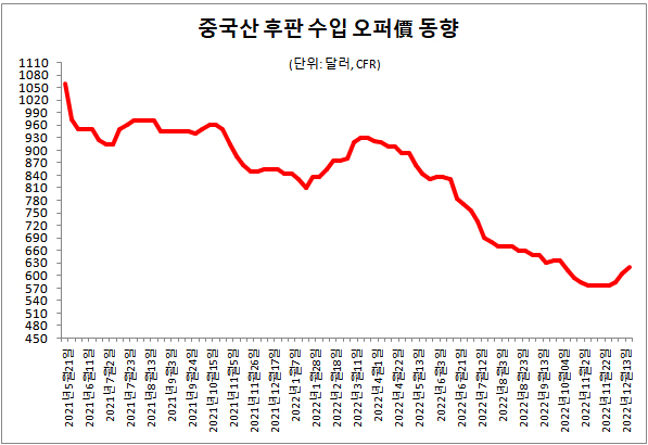 중국내 코로나19 봉쇄 정책 완화와 이에 따른 철강 수요 개선 기대감이 현지 철강재 가격 상승으로 이어지면서 후판 수출 오퍼 가격의 상승세에도 영향을 미치고 있는 것으로 보인다.