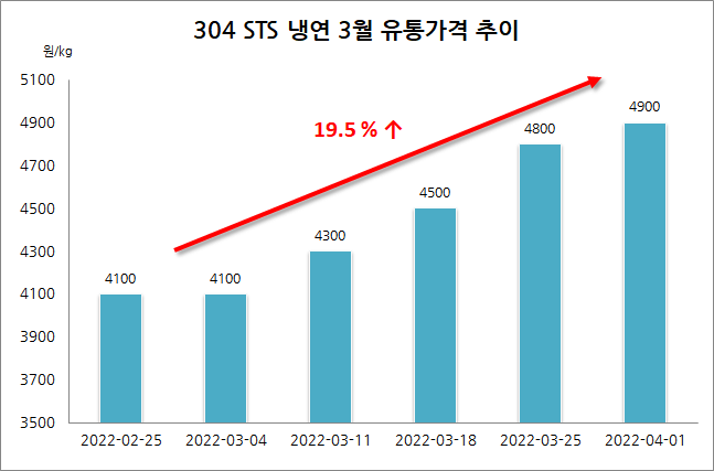 니켈가격의 변동성이 높아지던 시기 포스코는 4월 주문투입분 300계 가격을 톤당 50만원, 316L제품 10만원, 400계 제품 10만원 인상했다. 해외 오퍼가격도 당시 급등했다. 이런 영향으로 가수요가 폭발하며 국내산 가격은 3월 중에만 총 2~3차례 단가 인상되며 한 달 사이 50~90만원 급등했다. 포스코와 유통상의 가격 대폭 인상 후 올라간 가격대에서 거래 문의 급감했으며, 수요가들 원재 매입 부담에 망연자실할 수밖에 없게 됐다. 현재 국내 거래가격이 가진 모순은 사실상 3월 대폭 인상된 가격정책 기인한다고도 볼 수 있다.