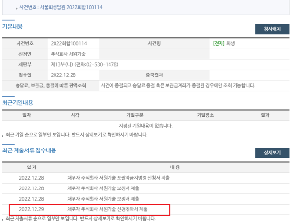 서원기술은 서울회생법원에 지난 12월 28일 회생절차를 신청한 다음날 29일 회생절차 신청을 취하했다. 회사측은 회생절차 신청을 취하했으며, 관련 업체들과는 협의를 통해 문제를 해결해나갈 것이라고 전했다.