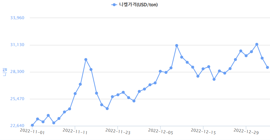 지난 1월 3일 니켈가격은 3만 1천 달러대를 돌파하며 지난해 4월 29일 이후 최고치를 기록했으나, 이후 차익 실현 움직임이 강하게 나타나면서 이틀 연속 가격이 하락한 것으로 분석됐다.