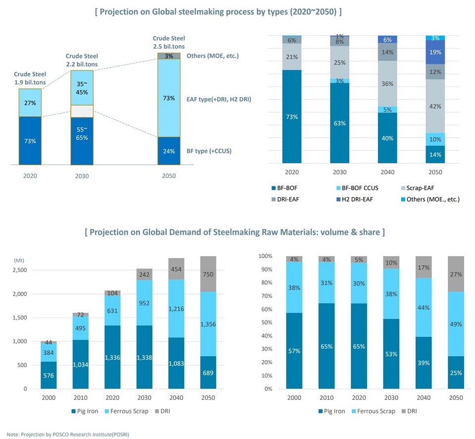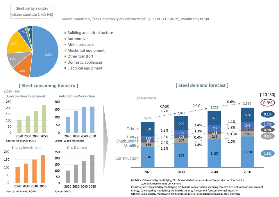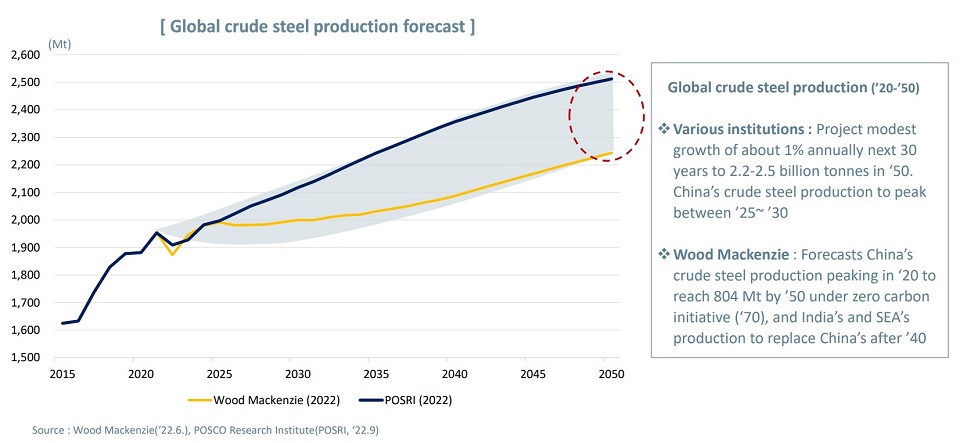 글로벌 철강수요의 경우 2050년까지 연평균 0.9%의 성장률을 기록하며 23억 5,000만 톤에 도달할 것으로 전망했다. 또한 탄소중립 기조에도 불구하고 글로벌 철강 생산은 2050년 22억~25억 톤을 기록할 것으로 내다봤다.