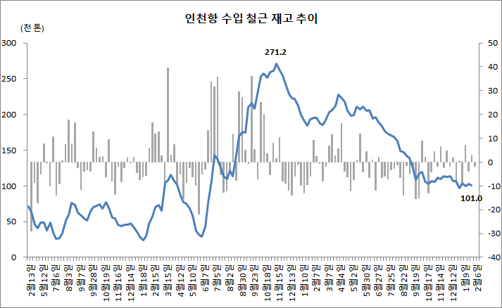 수입 업계에 따르면 2월 6일 기준 인천항 수입 철근 재고는 지난주 대비 1,900톤 줄어든 10만 1,000톤으로 집계됐다. 지난해 11월 초 이후 10만 톤 언저리에서 횡보하는 모습이 지속되고 있는 셈이다.