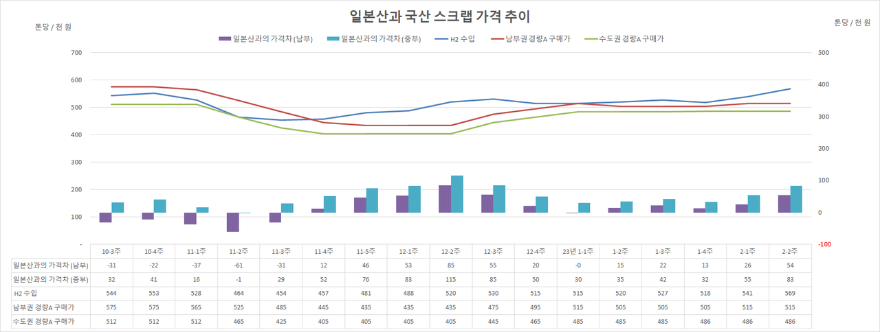 이번 관동철원협동조합 낙찰가격을 한국 도착 가격으로 환산하면 톤당 56만 9,000 원(9일 환율 기준, 해상운임 4,000 엔 적용) 가량으로 현재 남부권 제강사의 경량A 구매가격인 51만 5,000 원보다 5만 4,000 원 가량 더 높다. 통상적으로 H2와 경량A의 가격차이가 2만 원 ~ 3만 원 가량을 유지해 왔음을 감안하면 국산 스크랩 가격이 2만 원 이상 인상될 공간이 발생한 셈이다.