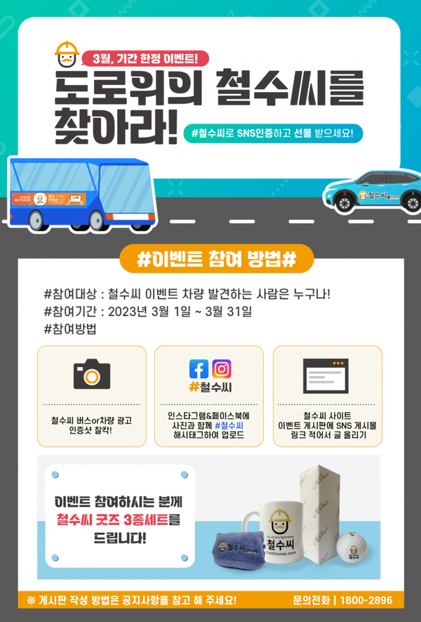 이번 이벤트는 ‘철수씨’를 알리기 위한 것으로 1) 버스나 차량에 부착된 철수씨 광고 인증샷을 보내거나 2) 인스타그램과 페이스북에서 철수시 해시태그로 업로드 하는 것 3) 철수씨 사이트에 SNS게시물 글 올리기 등을 통해 참여하면 된다.
