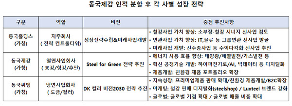 동국제강은 이번 인적분할로 존속법인 ‘동국홀딩스’(가칭)와 열연 전문화한 신설법인 ‘동국제강’(가칭)과 냉연 전문 신설법인‘동국씨엠’(가칭) 체제로 전환할 계획이다.