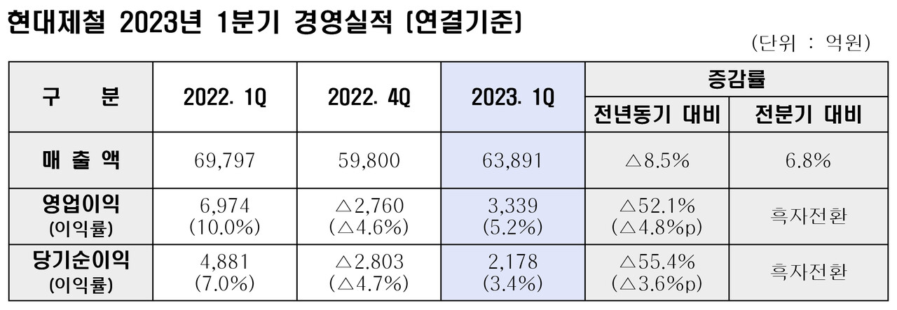 현대제철은 올해 1분기 연결기준 매출액 6조3,891억원, 영업이익 3,339억원, 당기순이익 2,178억원을 기록하며 흑자전환했다고 26일 공시를 통해 밝혔다.
