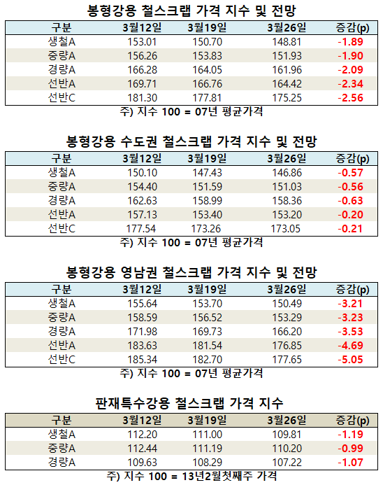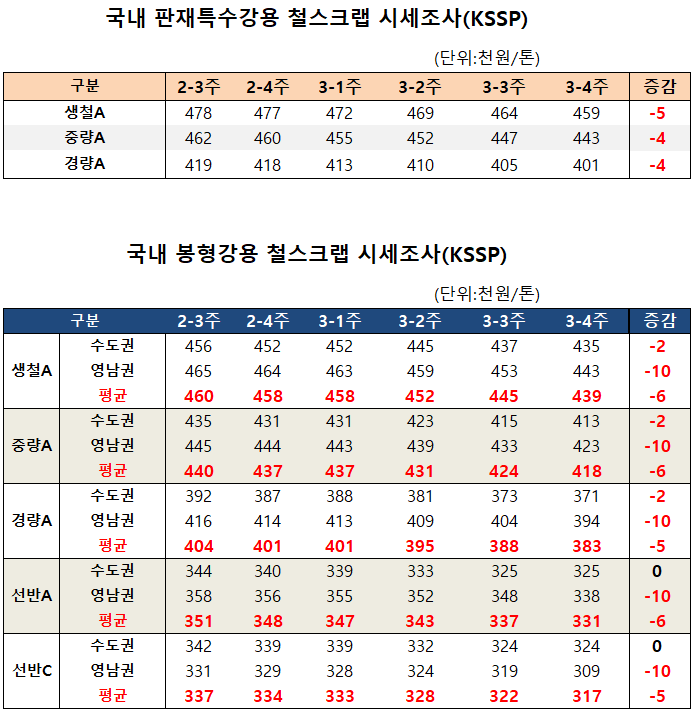 생철A는 수도권에서 2,000원 하락한 43만 5,000원, 영남에서는 1만 원 하락한 44만 3,000원, 중량A는 2,000원 하락한 41만 3,000원, 영남에서는 1만 원 하락한 42만 3,000원, 경량A는 수도권에서 2,000원 하락한 37만 1,000원, 영남에서는 1만 원 하락한 39만 4,000원, 선반C는 수도권에서는 횡보 영남에서는 30만 9,000원으로 1만 원 하락했다.