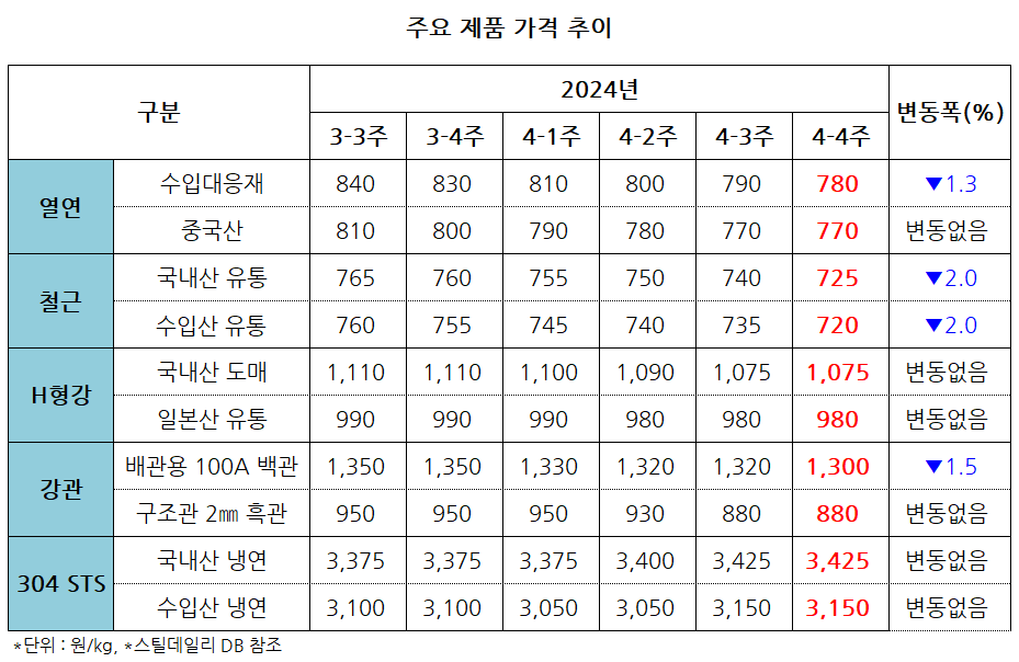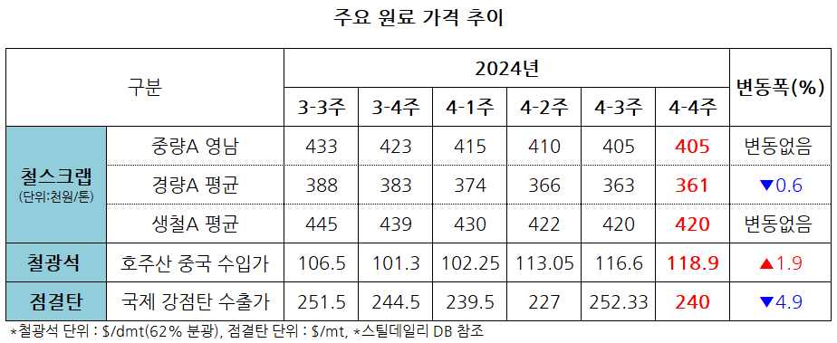 철 스크랩 가격은 하락세에 일단 브레이크가 걸리긴 했지만 지속된 부진에 시장의 피로감이 커지고 있어 바닥 확인은 어려운 상황이다. 수도권을 중심으로 추가 가격 하락세가 나타났고, 공장 비가동을 늘리겠다고 공언한 대형 철근 제강사들의 발표는 바닥을 더욱 흔드는 역할을 하고 있다. 남부권은 가격 변동이 없었지만 가격인하를 추격하는 과정에서 차주 가격 하락 가능성이 높아 보인다.