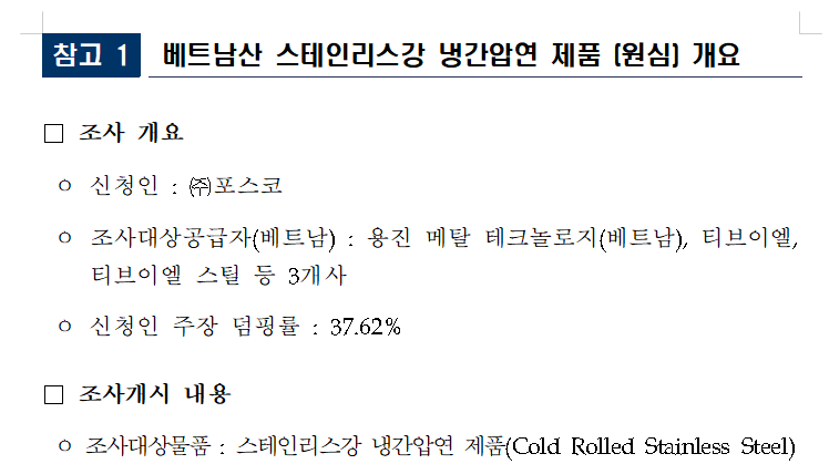 다시 정리하자면, 베트남산 스테인리스강 냉간압연 제품의 반덤핑조사 일정은 조사신청(‘24.4.30.) → 조사개시(’24.5.30.) → 예비판정(‘24.10월 예정) → 본조사 진행 예정이다. 예비관세 즉 잠정관세 여부는 오는 10월 경 윤곽을 드러낼 전망이다.