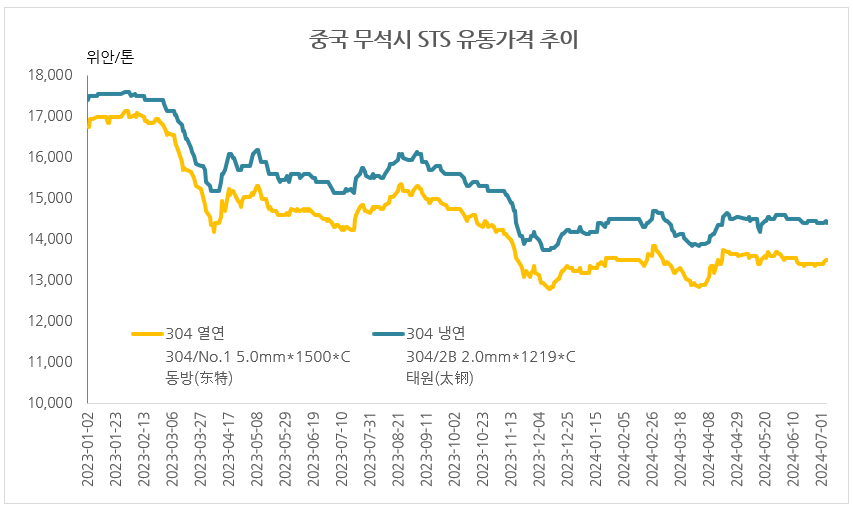 7월 17일 중국 무석 기준 304 냉연 내수 가격은 티스코 기준 1만 4,450위안 수준으로 전주대비 큰 변동은 없는 상황이다. 아시아 지역의 거래가격도 니켈 약세와 함께 지지부진한 상황으로 파악됐다. 인니 청산이 블랙코일을 종전대비 15달러 정도 인상했다. 아시아 지역의 304 열연의 거래가격은 1,900달러 수준이며, 304 냉연의 거래가격은 2,030~2,050달러 수준이다.