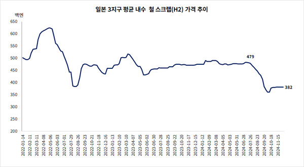 일본철원협회가 조사한 12월 첫째주 일본 3지구 철 스크랩 평균가격(H2, 메이커로전)이 톤당 3만 8,200엔으로 보합세를 이어가고 있다.