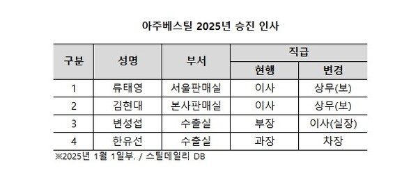 강관 전문 공급 기업 아주베스틸(대표이사 박유덕)은 2025년 총 4명의 직원 승진 인사를 단행했다. 아주베스틸의 직원 승진 명단은 아래와 같다. 저작권자 © 스틸데일리 무단전재 및 재배포 금지 이명화 선임기자 lmh@steelnsteel.co.kr 기자의 다른기사 관련기사 인도 진달 SAW, 전기 조달 위해 '리뉴그린 MHH' 지분 인수 美 상무부, 中 탄소강 라인 파이프 CVD 부과 결정 11월 美 철강 수입 206만 톤···라인파이프 9만 톤 넘어 11월 中 각관 수입 6천 톤 미만···"불확실성 확대 영향" [BSI] 1월 업황 개선 기대감 표출···관건은 역시 수요 [1월 전망-강관] 1분기 영업일 59일···판매 속도전 개의 댓글 회원로그인 댓글 내용입력 댓글 정렬 BEST댓글 BEST 댓글 답글과 추천수를 합산하여 자동으로 노출됩니다. 닫기 더보기 댓글삭제 삭제한 댓글은 다시 복구할 수 없습니다. 그래도 삭제하시겠습니까? 비밀번호 닫기 댓글수정 댓글 수정은 작성 후 1분내에만 가능합니다. 본문 / 400 비밀번호 닫기 내 댓글 모음 닫기