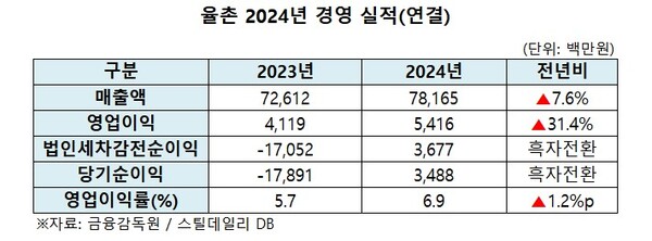 율촌은 7일 금융감독원 공시를 통해 2024년 연결 기준 경영 실적을 발표하고 △매출액 781억 6,500만 원(전년비 7.6% 증가) △영업이익 54억 1,600만 원(전년비 31.4% 증가) △순이익 34억 8,800만 원(흑자전환)을 기록했다고 밝혔다.
