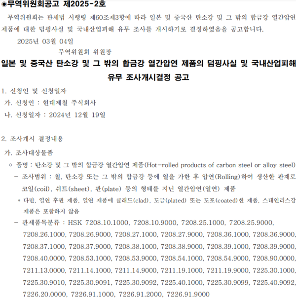 앞서 탄소강 열연 생산자인 현대제철은 일본 및 중국산 탄소강 열연에 대해 2024년 12월 19일 반덤핑 제소장을 제출했다.