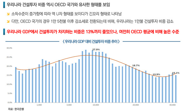 다만, 중장기적으로는 건설 투자 비중이 점진적으로 감소할 것으로 보인다. 한국의 건설 투자는 과거 GDP의 20~30%를 차지했지만, 지금은 13% 수준까지 내려왔다. OECD 평균이 10.5%인 점을 고려하면, 향후 한국의 건설 투자 비중도 12% 이하로 하락할 가능성이 있다.