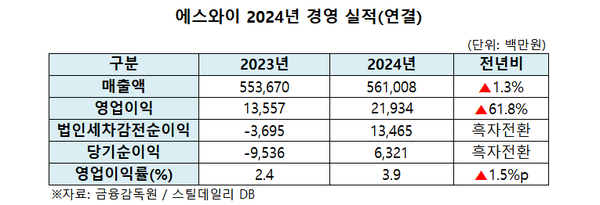 에스와이는 13일 금융감독원 공시를 통해 지난해 연결 기준 경영 실적을 발표하고 △매출액 5,610억 8백만 원(전년비 1.3% 증가) △영업이익 219억 3,400만 원(전년비 61.8% 증가) △순이익 63억 2,100만 원(흑자전환)을 달성했다고 밝혔다. 영업이익률은 3.9%를 기록했다.