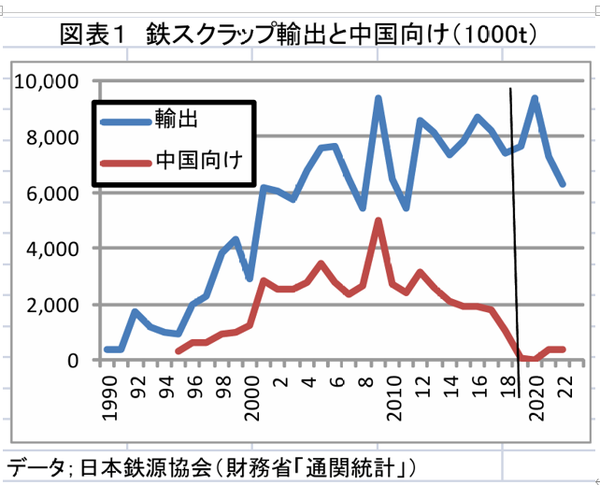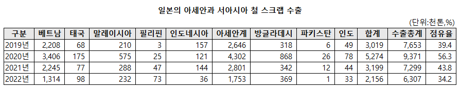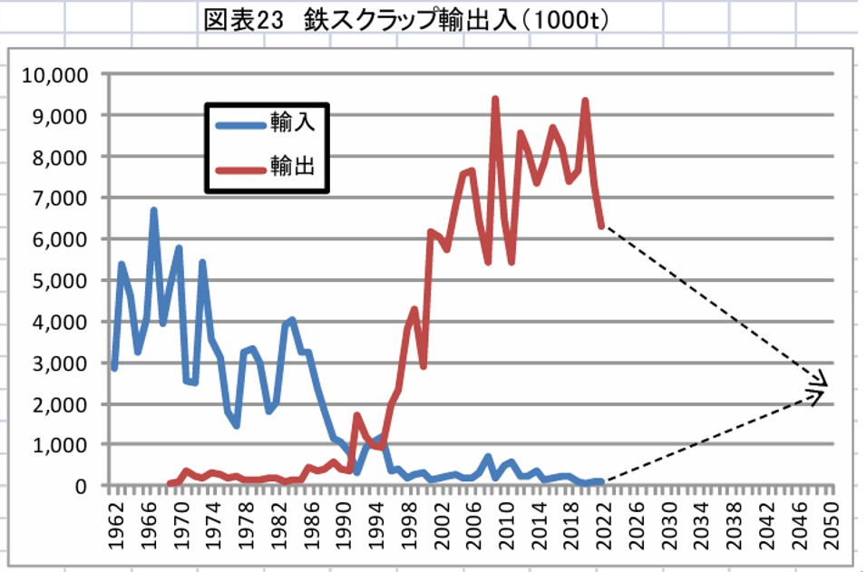 2022년의 일본의 철 스크랩 수출량은 631만 톤으로, 2010년의 646만 톤 이후 가장 낮은 수준을 기록했다. 2012년~2017년 800만 톤씩 수출하던 것과 비교하면 매우 적은 것으로 수급 환경이 변해 줄어든 것이다. 미래를 전망하기 쉽지 않은 상황이다.