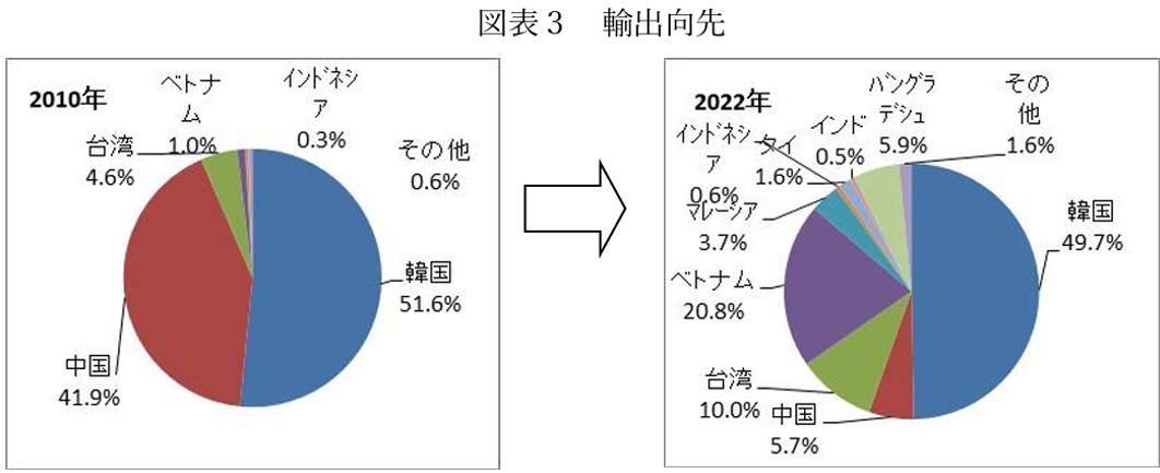 2022년(631만 톤)과 2010년(646만 톤)은 수출량이 비슷하다. 수출지역을 비교하면 한국이 50%를 차지한 것은 같았다. 그러나 중국이 크게 줄면서 대만 베트남 말레이시아 등 동남아시아와 방글라데시 등으로 수출이 늘었다. 수출지역이 다변화되었고 원거리까지 수출이 이루어졌다.