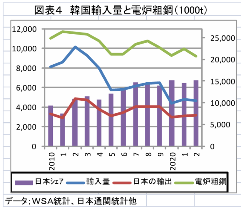 전체 수입량은 줄고 있지만 일본의 점유율은 2017년 이후 65% 전후를 유지하고 있다. 한국에게 일본은 근거리 운송이라는 이점에 더해 신다찌와 같은 고급 스크랩의 공급처이다.