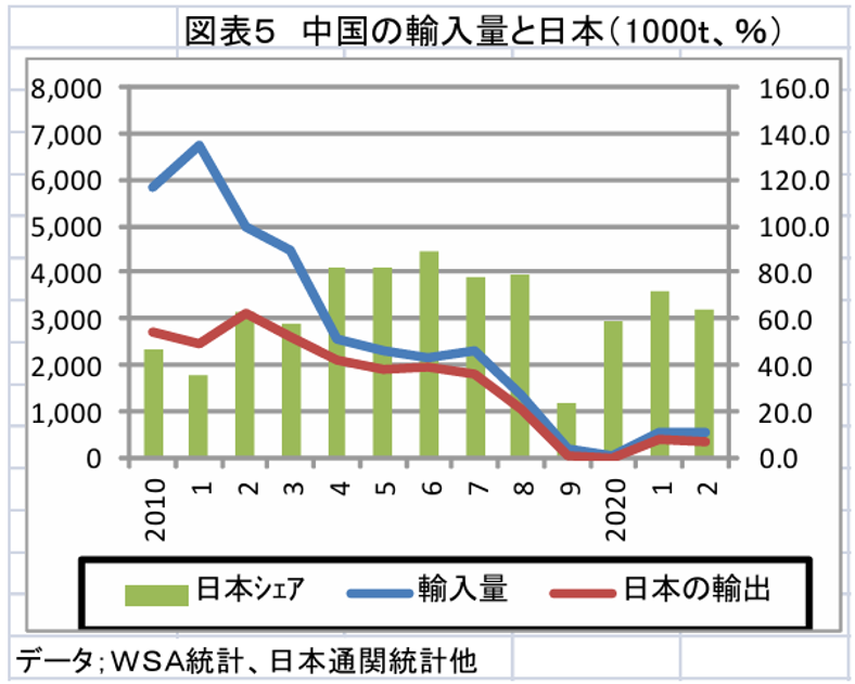 ② 중국 : 2018년 말에 환경 보호를 이유로 스크랩 수입을 금지했다. 2021년 1월에는 고품위 스크랩만 수입을 허가했다. 중국은 100억 톤이 넘는 축적량을 갖고 있다. 수입은 유통이나 중간 처리가 정비될 때까지 일회성으로 이루어진 것이다.