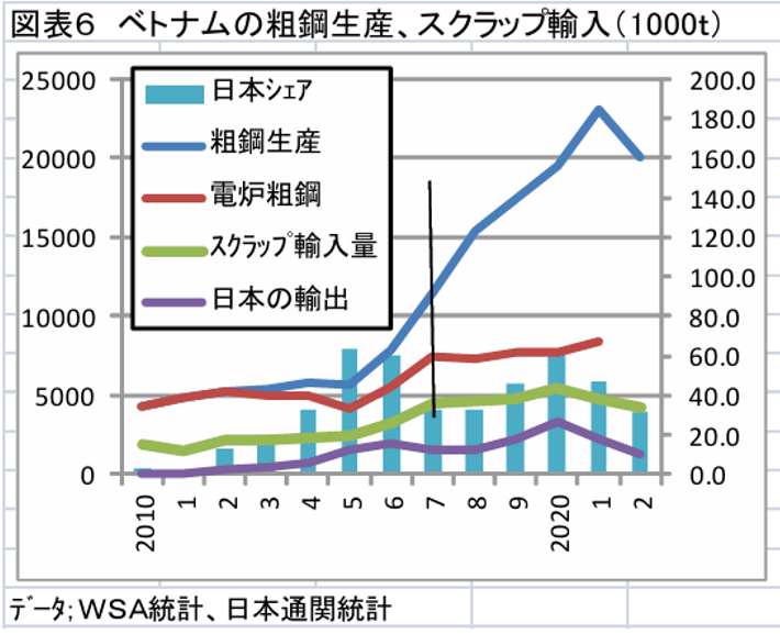 첫번째는 2018년 말에 발표된 중국의 잡빙(雑品) 수입 금지이고, 두번째는 수출지역 증가와 다변화 세번째는 아세안 지역의 중국계 고로의 건설 네번째는 2020년 10월 이후 발표된 탄소중립을 위한 전기로 투자 촉진과 일본의 수출 여력의 문제이다. 특히 아세안지역의 고로 건설은 원거리 수출을 위해 이시카리 항 정비 이후 불거진 것이어서 시장에 상당한 영향을 줄 것으로 보인다.
