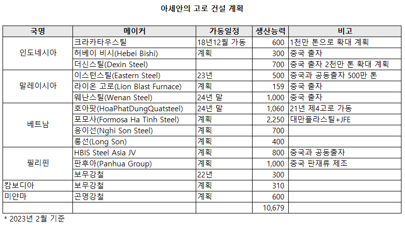 코로나 팬데믹 등으로 건설이 늦어지고 있다. 2020년 무렵 아세안지역 6개국이 16개의 신규 고로 건설을 계획이 있었다. 대부분 2025년~2030년 사이에 가동될 예정이다. 역내 공급이 부족한 판재류 수요에 대응하기 위한 투자이다. 중국의 설비 과잉도 문제이지만 계획된 모든 투자가 마무리되면 공급과잉으로 바뀔 가능성도 있어 우려된다.