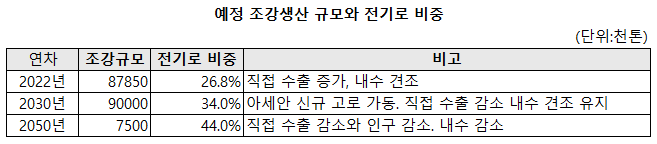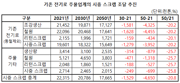 기존 전기로사를 보통강 전기로와 특수강 전기로로 나누어 예상해 보았다. 시장은 내수가 중심이지만 보통강은 건설, 특수강은 자동차, 산업기계 등을 고려해 조강 생산량을 추정했다. 양쪽 모두 인구 감소의 영향을 받아 2050년에는 전기로 20%, 주물 25% 감산이 예상된다. 주원료인 스크랩 소비도 비슷하게 줄어들 것이다.