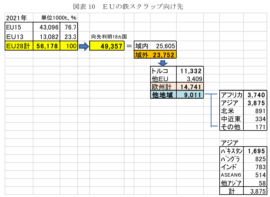 EU 의회에서는 탄소중립이나 환경면에서 폐플라스틱 등 ‘폐기물 전반’의 역외 수출을 규제하고 있다. 가공한 스크랩을 폐기물에 포함시킬 것인지 여부도 심의가 계속되고 있다. 2023년1월에는 OECD 가맹국만 수출을 승인한 바젤법과 비슷하게 만들어질 것 같다. 철 스크랩 규제에 대비해 현재 약 1,000만 톤에 달하는 역외 시장이 일본의 수출지역으로 부상중이다.