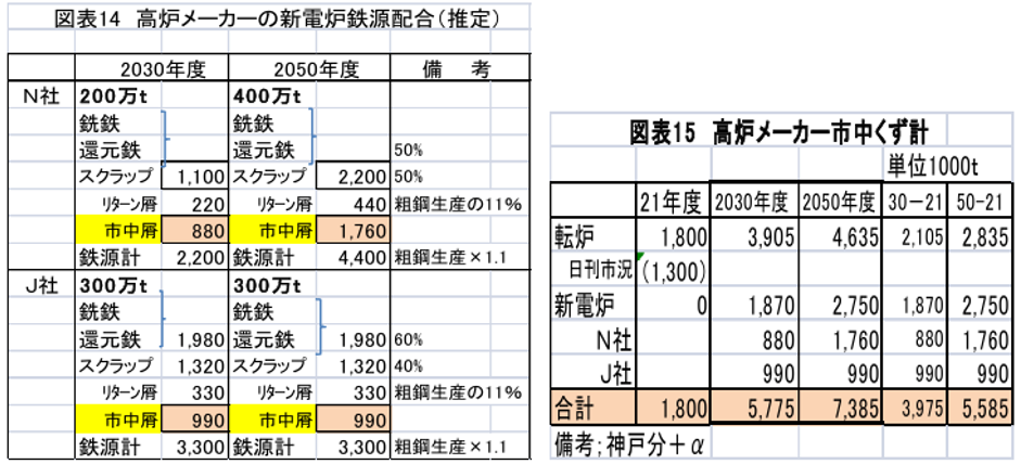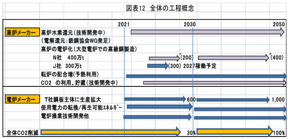전기로화 계획은 N사가 400만 톤, J사가 300만 톤을 추진하고 있다. N사는 400만 톤의 설치 장소 등 구체적인 발표가 아직 없다. J사는 구라시키에서 27년에 가동할 예정이다.