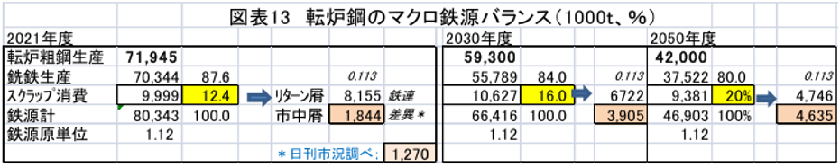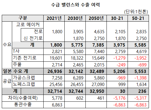 2030년은 일본의 철 스크랩 수요는 3,214만 톤, 공급은 3,270만 톤으로 예상된다. 숫자상으로 수출여력은 60만 톤에 불과하다. 2050년에는 46만 톤으로 줄어 들게 된다. 각 계수의 설정 오차를 감안하면, 2030년까지는 일본의 스크랩 수급이 균형을 이루고 2050년에는 수입을 해야 할지도 모르겠다.