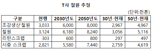 ① T사 : 조강 생산은 현재 300만 톤에서 2030년은 600만 톤, 2050년 1,000만 톤으로 늘릴 계획이다. 선철이나 DRI는 사용하지 않고 시중에서 스크랩을 구매해 생산할 예정이다. 2030년 560만 톤, 2050년 740만 톤 정도 예상된다. 지금보다 2030년 270만 톤 증가, 2050년 460만 톤 증가가 예상된다.