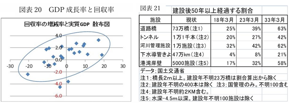 GDP 성장률과 노폐 스크랩 회수율은 정의 관계에 있다. 회수율 상승은 경제활동이 활황이라는 것을 의미한다. 향후 일본은 중장기적으로 저성장이 예상된다. 이 상태라면 발생 잠재력은 1.8%도 유지 못할지도 모른다. 게다가 인구 감소로 회수 노동력이나 지방 재정난이 예상된다. 특히 인프라 갱신 회수를 촉진시키는 행정 정책이나 기술 개발이 필요한 상황이다. 회수율 0.1% 포인트를 늘리면 150만 톤의 노폐 스크랩 발생이 늘어난다.