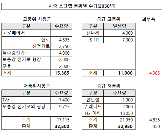 지금까지는 총량에 대해 보았다. 스크랩은 다양한 등급이 있다. 강재 생산에 따라 배합을 달리하고 있다. 2050년 수요와 공급 예측을 고품위와 저품위 2그룹으로 나누어 검토하면 고품위 스크랩은 고로사, 특수강 전기로, 보통강 형강, 주물업체에서 필요하다. 1,540만 톤 정도 필요하다. 총 수요 3,250만 톤의 절반을 차지한다. 반면 신다찌, HS, H1 공급은 1,100만 톤정도다. 수요에 비해 440만 톤이 부족하다.