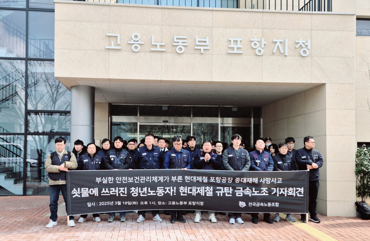 현대제철 민주노총 조합원들이 지난 18일 고용노동부 포항지청 앞에서 최근 현대제철 포항1공장에서 발생한 20대 비정규직직원 사망사고와 관련해 철저한 조사와 안전대책 마련을 촉구하는 기자회견을 열었다.