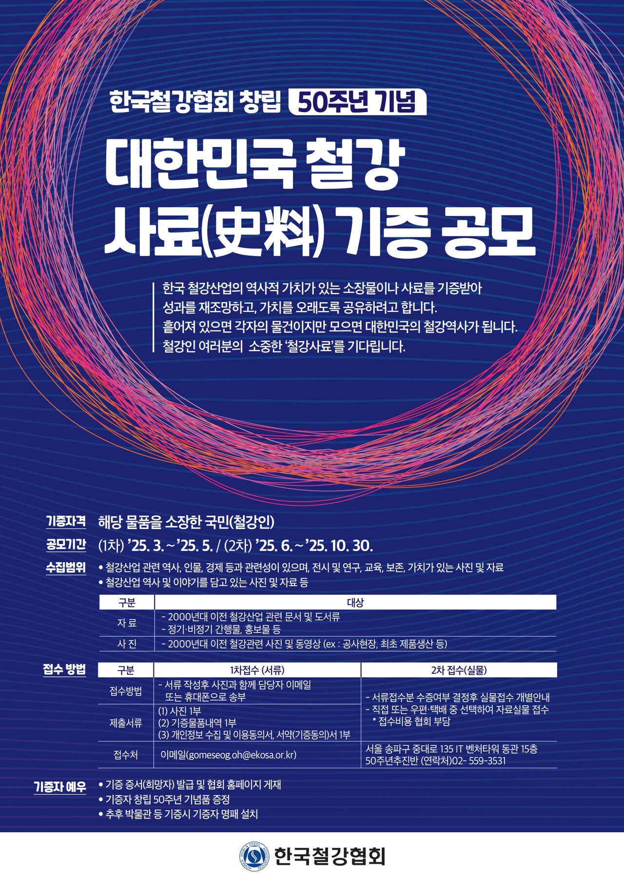 한국철강협회가 금년 창립 50주년(7월 9일)을 맞아 후세들에게 남겨줄 수 있는 역사적 가치가 있는 철강 소장물이나 사료를 기증 받아 철강산업의 성과를 재조명하고 철강업계에 공유하기 위해 철강사료 기증 공모 사업을 추진한다.
