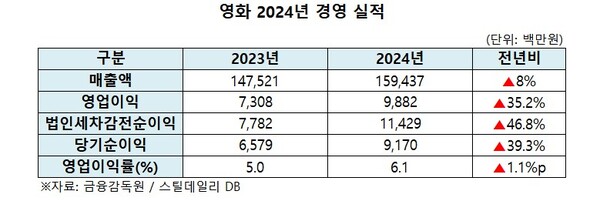 영화는 7일 금융감독원에 감사보고서를 제출하고 2024년 경영 실적을 발표했다. 감사보고서에 따르면 2024년 실적은 △매출액 1,594억 3,700만 원(전년 대비 8% 증가) △영업이익 98억 8,200만 원(전년 대비 35.2% 증가) △순이익 91억 7,000만 원(전년 대비 39.3% 증가)을 달성했다고 밝혔다.