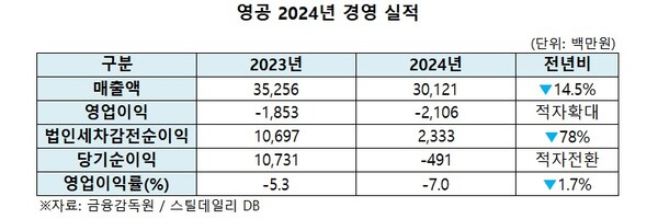 영공은 최근 금융감독원에 감사보고서를 제출하고 2024년 실적에 대해 △매출액 301억 2,100만 원(전년 대비 14.5% 감소) △영업손실 21억 600만 원(적자확대) △순손실 4억 9,100만 원(적자전환)을 기록했다고 밝혔다.