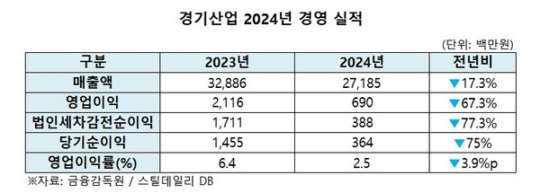 경기산업은 14일 금융감독원에 감사보고서를 제출하고 2024년 경영 실적에 대해 △매출액 271억 8,500만 원(전년 대비 17.3% 감소) △영업이익 6억 9,000만 원(전년 대비 67.3% 감소) △순이익 3억 6,400만 원(전년 대비 75% 감소)을 달성했다고 밝혔다.