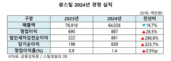광스틸은 최근 금융감독원에 감사보고서를 제출하고 2024년 경영 실적에 대해 △매출액 640억 2,600만 원(전년 대비 16.7% 감소) △영업이익 8억 8,700만 원(전년 대비 28.5% 증가) △순이익 8억 3,900만 원(전년 대비 323.7% 증가)을 달성했다고 밝혔다.