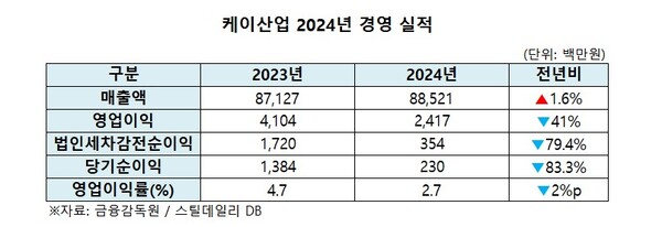 케이산업은 최근 금융감독원에 감사보고서를 제출하고 2024년 경영 실적에 대해 △매출액 885억 2,100만 원(전년 대비 1.6% 증가) △영업이익 24억 1,700만 원(전년 대비 41% 감소) △순이익 2억 3,000만 원(전년 대비 83.3% 감소)을 기록했다고 밝혔다.