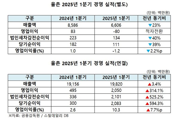 율촌은 지난 15일 금융감독원에 분기보고서를 제출하고, 1분기 별도 기준 실적에 대해 △매출액 66억 600만 원(전년 동기 대비 23% 감소) △영업손실 8,000만 원(적자전환) △순이익 1억 1,100만 원(전년 동기 대비 39% 감소)을 기록했다고 밝혔다.
