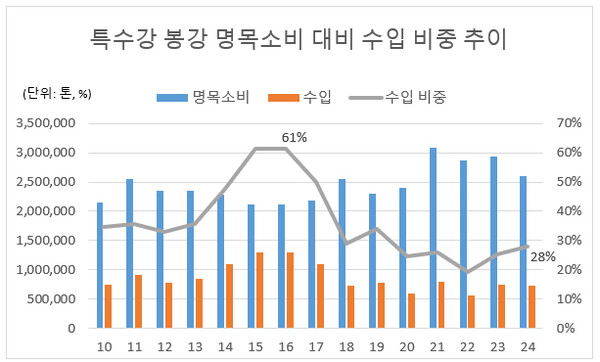 그러나 국내 특수강봉강 시장은 중국산 탄합봉강의 수입량 증가와 저가 공세로 심각한 교란을 겪고 있다. 한국철강협회 자료에 따르면, 2024년 특수강봉강 명목소비량은 약 259만 5,379톤이며, 이 중 수입 비중은 28%(72만 1,175톤)에 달한다.