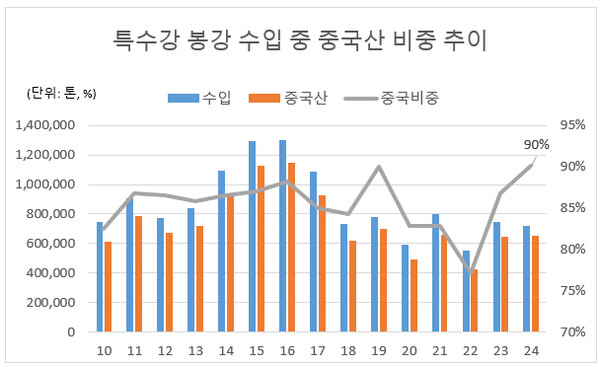 더욱 심각한 문제는 수입량에서 중국산이 차지하는 비중의 급격한 증가다. 2024년 중국산 특수강봉강 수입량은 전체 수입의 약 90%인 64만 9,803톤을 기록했다. 이는 2022년 중국산 비중 77%(42만 7,454톤)에서 크게 늘어난 수치다.