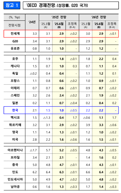 OECD는 2025년 세계 경제 성장률을 2.9%로, 기존 3월 전망(3.1%) 대비 0.2%포인트 하향 조정했다. 2026년 성장률 역시 2.9%로 낮춰잡았다. 특히 미국, 캐나다, 멕시코 등 주요국의 성장세 둔화가 두드러질 것으로 예상했다. 미국의 경우 실효 관세율 상승과 보복성 무역조치로 인해 2025년 성장률이 1.6%에 그칠 것으로 보이며, 이는 3월 전망 대비 0.6%포인트 하락한 수치다.