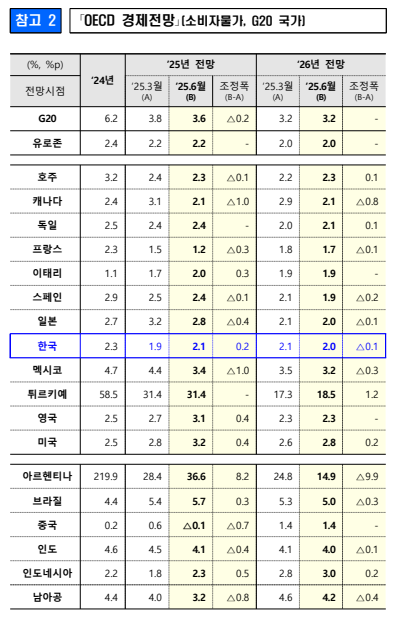 OECD는 한국의 물가상승률에 대해서는 2025년 2.1%, 2026년 2.0%로 예측했다. 이는 중앙은행의 목표치에 근접한 수준으로, 국내 수요 회복이 제한적인 가운데 물가 압력은 완화될 것으로 풀이된다.