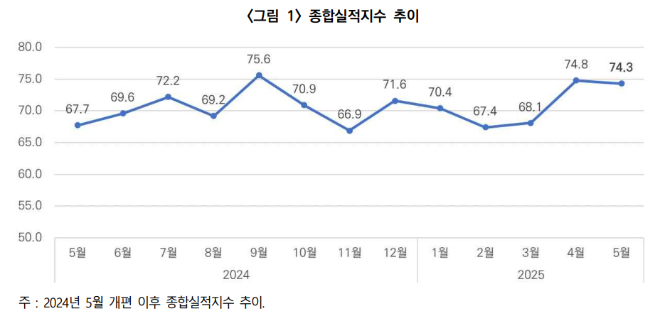 구체적으로 2025년 5월 종합실적지수는 74.3으로, 전월(74.8) 대비 0.5p 하락했다. 이는 지수 기준선인 100을 크게 하회하는 수준으로, 건설업계 전반의 경기 위축이 지속되고 있음을 나타낸다.
